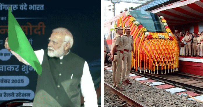 ദില്ലി: കേരളത്തിന് അനുവദിച്ച മൂന്നാം വന്ദേഭാരത് ട്രെയിൻ പ്രധാനമന്ത്രി നരേന്ദ്ര മോദി ഫ്ലാഗ് ഓഫ് ചെയ്തു. ഓൺലൈനായിട്ടാണ് ഫ്ലാഗ് ഓഫ് നിർവഹിച്ചത്. എറണാകുളം-ബെംഗളൂരു റൂട്ടിലോടുന്ന വന്ദേഭാരതിന്റെ ട്രയൽ റൺ കഴിഞ്ഞ ദിവസം പൂർത്തിയായിരുന്നു. എറണാകുളം സൗത്ത് റെയിൽവേ സ്റ്റേഷനിൽ പ്രത്യേക വേദി സജ്ജമാക്കിയിരുന്നു. എറണാകുളം സൗത്ത് സ്റ്റേഷനിൽ നിന്ന് പുറപ്പെട്ട് വൈകിട്ട് ബെംഗളൂരുവിൽ എത്തിച്ചേരും. എട്ട് മണിക്ക് ഫ്ലാഗ് ഓഫ് ചെയ്യുമെന്നാണ് ആദ്യം അറിയിച്ചിരുന്നത്. എന്നാൽ 8.45ഓടെയാണ് ഫ്ലാഗ് ഓഫ് ചെയ്തത്. വാരാണസിയിൽ 4 പുതിയ വന്ദേഭാരത് ട്രെയിനുകൾ മോദി ഉദ്ഘാടനം ചെയ്തു. എറണാകുളം – ബെംഗളൂരു കൂടാതെ, ബനാറസ് – ഖജുരാഹൊ, ലക്നൌ-, ഫിറോസ്പൂർ – ദില്ലി ട്രെയിനുകൾ ആണ് മോദി ഫ്ലാഗ് ഓഫ് ചെയ്തത്.